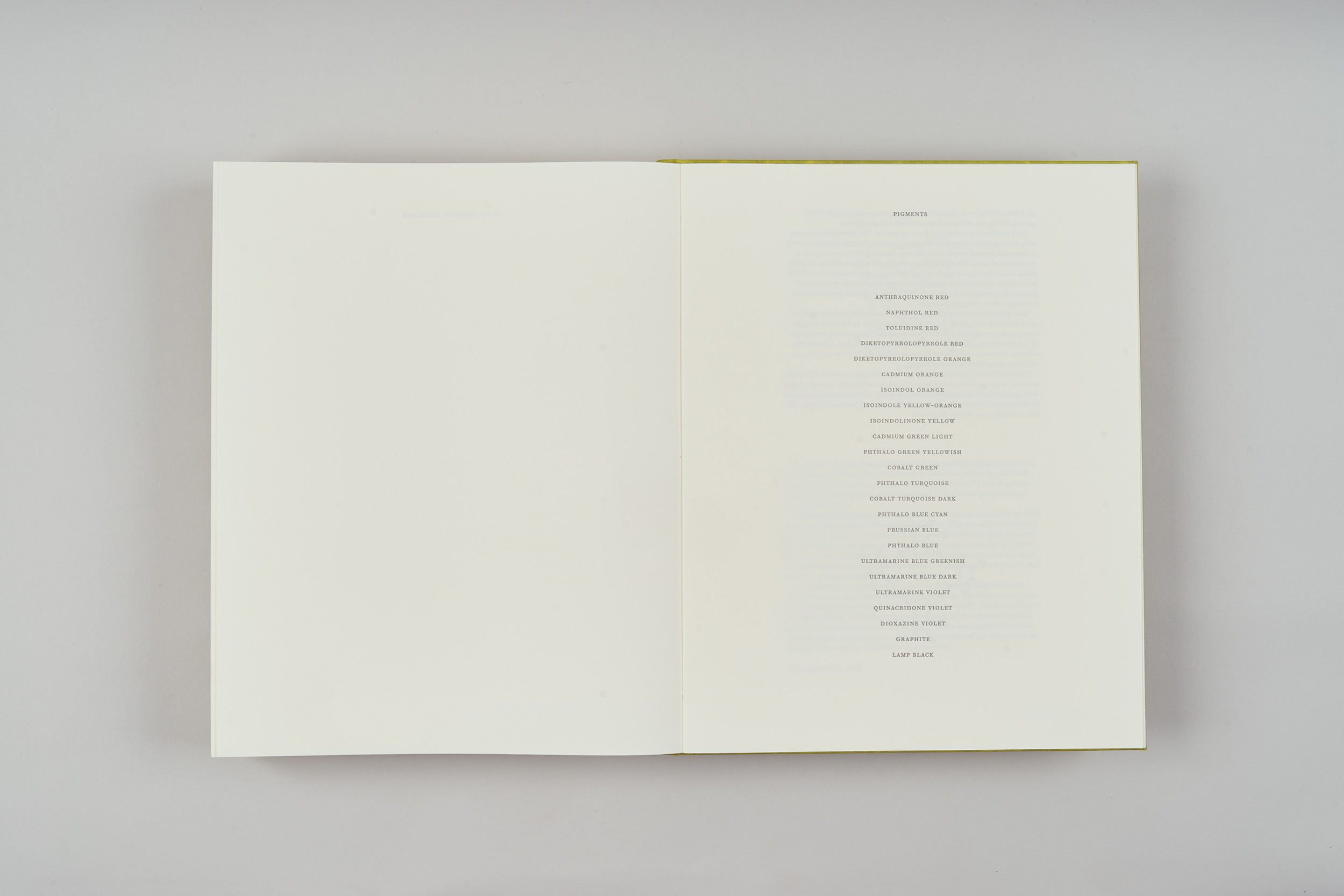 Each sheet of paper is made from a single pigment, using a 19th century recipe for marbling paint. The book is arranged to create a rainbow made from pure pigments. The book is an exercise in observing the inherent properties of color, texture, and behavior of each pigment in its raw form. The unique structure of the book, a reinforced accordion which is held together at the spine by six individual necklace clasps, allows the book to be safely read and handled in standard book form. Unclasped, the book may be stood up and stretched end to end, becoming a sculpture (or “necklace”) long enough to adorn a room. The book includes a sewn-in letterpress pamphlet with the pigments listed in the order they are used, along with an essay by Oppenheim on art and chemistry.